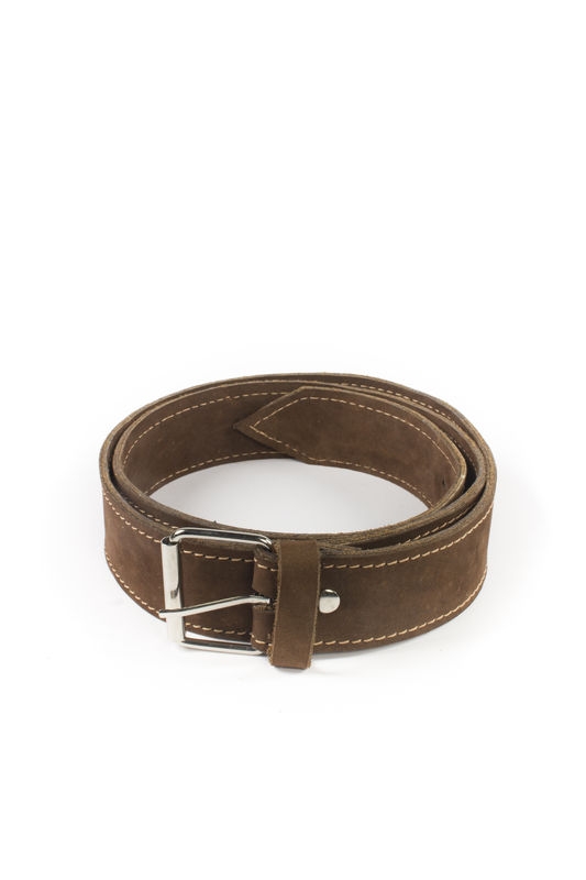 Stijlvolle riem, handgemaakt van bruin nubuckleer. Lengte: 110cm