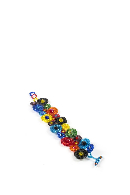 Handgemaakte stijlvolle armband van recyclede glaskralen. Bijpassende oorhangers en ketting beschikbaar.