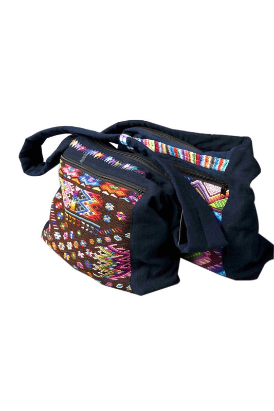 Handgemaakte fairtrade Kano-model tas met traditionele huipil ter decoratie. De tas heeft een ritssluiting en de schouderband is lang genoeg om kruiselings te dragen. Afmeting 42x32cm.