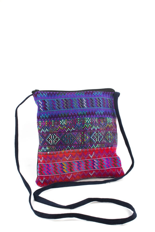 Handgemaakte fairtrade tas met dunne schouderband. Aan de voorzijde is een huipil hergebruikt. Huipiles zijn de traditionele Maya tunieken die door de vrouwen worden geweven en gedragen tot er gaten in komen, dan wordt de huipil verkocht en hergebruikt in o.a. deze tassen. Afmetingen: 20 x 22cm.