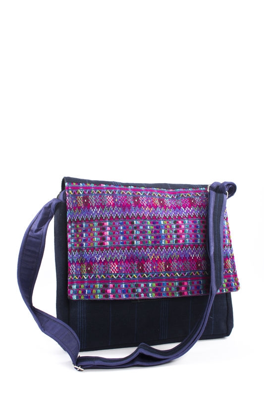 Handgemaakte koerierstas van de donkerblauwe Nahualastof, met klep en een hergebruikte huipil erin verwerkt. Deze huipil is een traditionele Maya tuniek uit Todos Santos, Guatemala. Maat: 25cmx25cm met schouderband van 125cm lang. 1 rits voor het hoofdvak en 1 rits aan de achterkant van de tas.