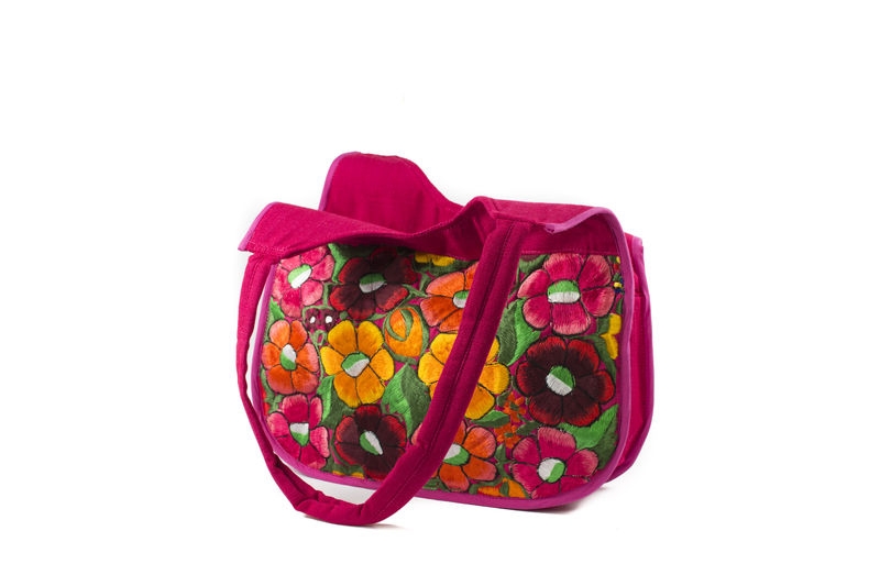 Vrolijke hand/schouder tas, handgemaakt van katoen, kleur roze met aan de voorzijde geborduurde bloemen. 1 hoofd rits, 1 binnen rits en 1 rits aan achterzijde. Afmetingen: 35cm breed hoogte 26 cm en diep 10 cm