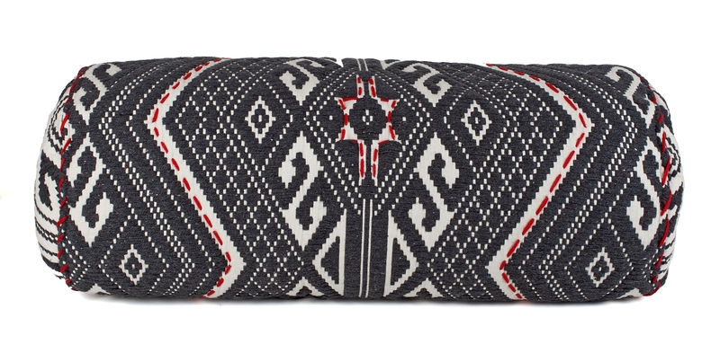 Dit rolkussen is geweven met een jacquardweefgetouw. Het patroon op deze kussens zijn geïnspireerd op de ?khark` borduurtechniek wat zich kenmerkt door lange steken en versieringen met spiegels. Deze techniek is vertaald naar een etnische Mexicaanse stijl. Afmeting 40x60cm.