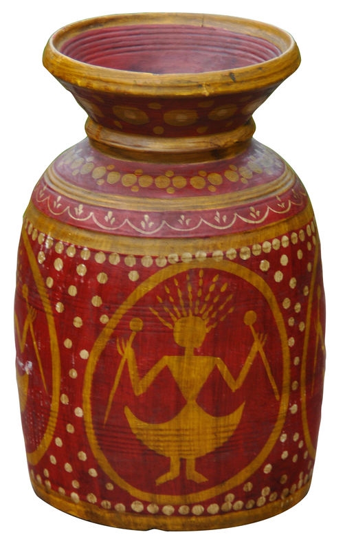 Deze vintage vaas uit India is al ca. 70-80 jaar oud, vroeger werd het gebruikt als pot om graan en rijst in te bewaren maar ook om water mee te brengen van de waterput. De vaas komt uit de vintage collectie van de Wereldwinkel. De producten zijn allemaal authentiek en onder fairtrade omstandigheden hersteld. Afmeting 15x35cm.